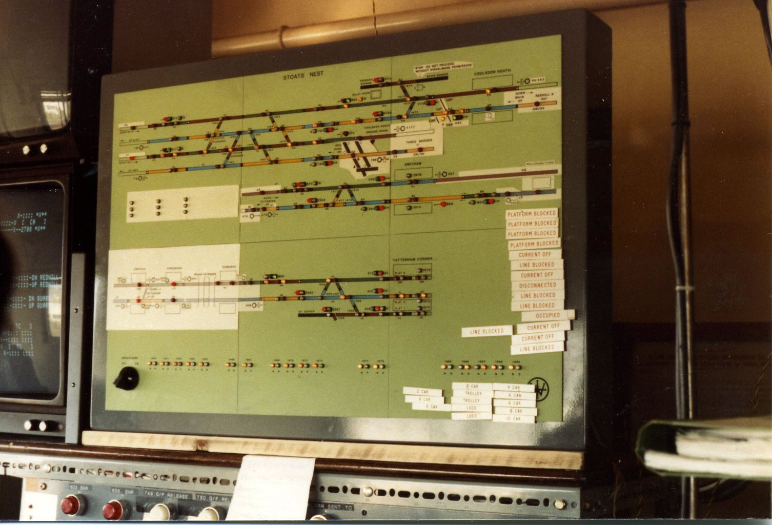 Some records say that the only the main line part of the panel closed on 14th January 1984, and that the Caterham and Tattenham branches were not transferred to Three Bridges until 23rd January 1984, perhaps due to some technical snag. So the box closure date is unclear. Part of the frame from here lives on, at Bekonskot Model Railway, Beaconsfield in Maryloo signalbox